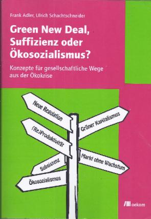 Frank Adler, Ulrich Schachtschneider: Green New Deal, Suffizienz oder Ökosozialismus? Konzepte für gesellschaftliche Wege aus der Ökokrise. München 2010Nach etwa zehn jahren Politik für das breit geteilte Ziel einer "nachhaltigen Entwicklung" sind keine wesentlichen Fortschritte zu verzeichnen. Vor allem die als notwendig erachteten nicht-technischen Nachhaltigkeitsansätze - etwa Änderungen im Sozialverhalten, in der Politik, sowie in der Raum- und Zeitstruktur - scheinen an tieferliegenden Strukturen moderner Gesellschaften zu scheitern. In dieser Arbeit wird versucht, die spezifischen Erklärungen verschiedener Metatheorien der Entwicklung moderner Gesellschaften für die Ursachenforschung fruchtbar zu machen. Ergebnis ist eine theorieübergreifend begründbare Hierarchie der Realisationschancen. Demnach lassen sich etwa Partizipation und Kommunarität eher an die Entwicklungslogik moderner Gesellschaften anschließen als Egalität und Suffizienz. Die schlechtesten Chancen haben Konsensualität und Regionalisierung.